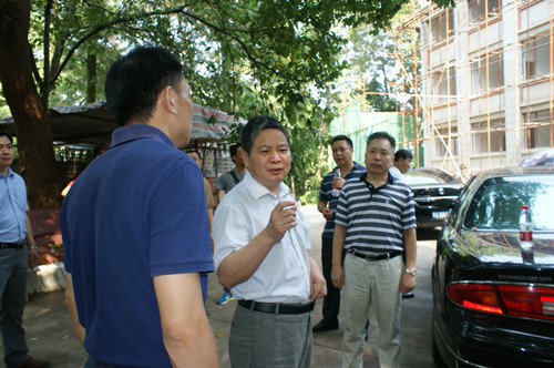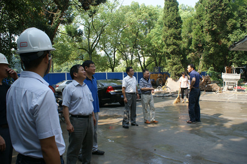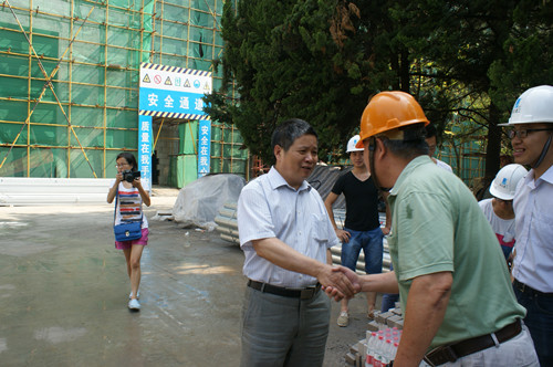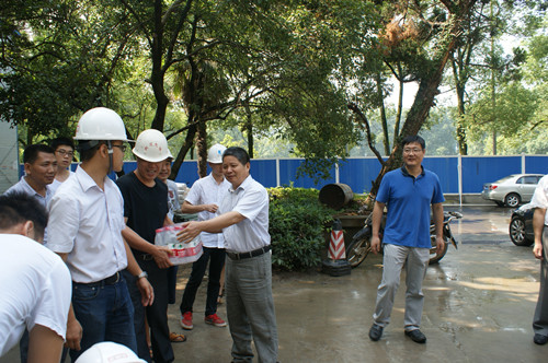 副校长谈广鸣实地查看了工程建设进展情况及各个服务岗位的工作情况,听取了各个职能部门相关负责人的介绍,并特地转达了校长李晓红的慰问,向职工们表示“天气炎热,你们辛苦了!”,与此同时,他也进一步强调了后勤保障、施工质量和校园安全等工作。