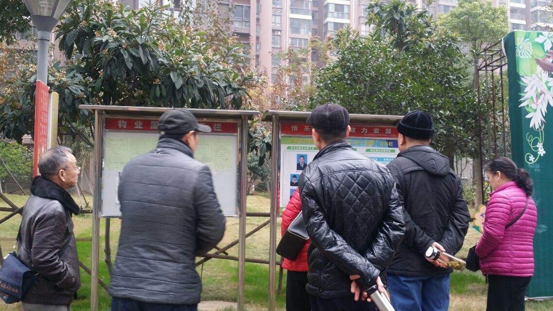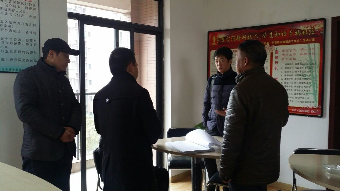 2015年12月9日上午,测绘社区书记周军、委员张巍、业主委员会主任金春华组织并带领本小区业委会委员、楼栋长和居民代表共16人,用了一天的时间,对参加此次物业公司招投标的武汉鑫银物业公司、武汉小竹物业公司、武汉君怡佳三家物业公司进行了实地考察。